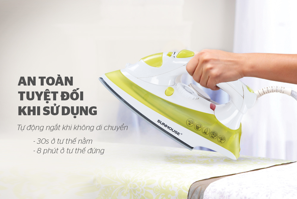 An tâm hoàn toàn khi sử dụng bàn là hơi SUNHOUSE vì được trang bị cảm biến nhiệt an toàn, tự động đóng ngắt khi quá tải nhiệt. Bàn là sẽ tự ngắt khi đạt đến nhiệt độ lý tưởng (phù hợp với các loại vải khác nhau).