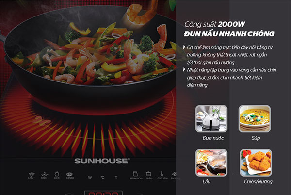 - Công suất hoạt động mạnh mẽ 2000W giúp đun nấu nhanh chóng, tiết kiệm đáng kể thời gian và điện năng của gia đình chúng ta