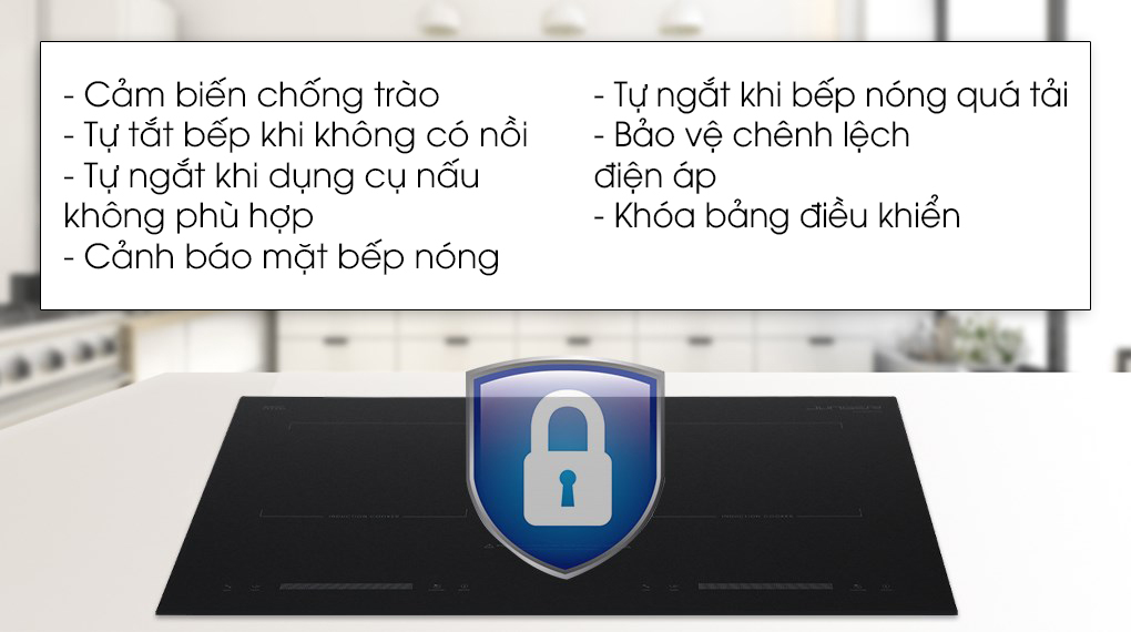 Tính năng an toàn: Bảo vệ chênh lệch điện ápCảnh báo dụng cụ nấu không phù hợpCảnh báo mặt bếp nóngKhóa bảng điều khiểnTự ngắt khi bếp nóng quá tảiTự ngắt khi không có nồiTự tắt bếp khi nước tràn