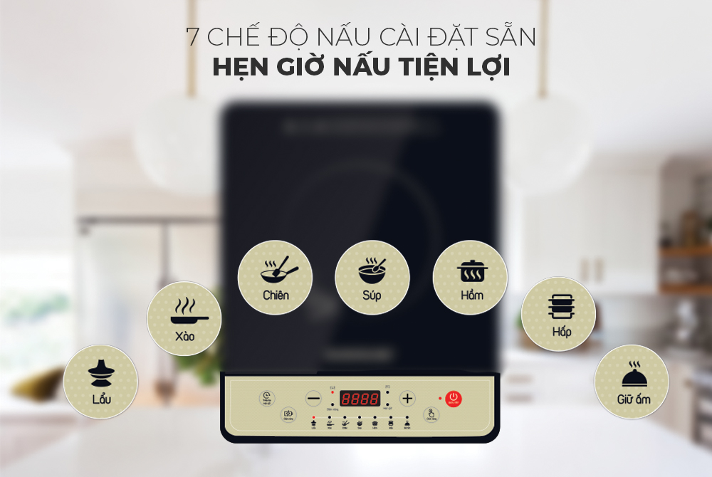 Bếp có đến 7 chế độ gồm: nấu lẩu, giữ ấm, súp, hầm, hấp, xào, chiên. Tùy vào mục đích sử dụng mà bạn sẽ nhanh chóng chọn được mức công suất phù hợp chỉ với một thao tác và không phải mất quá nhiều thời gian để điều chỉnh nhiệt độ khi nấu nướng.