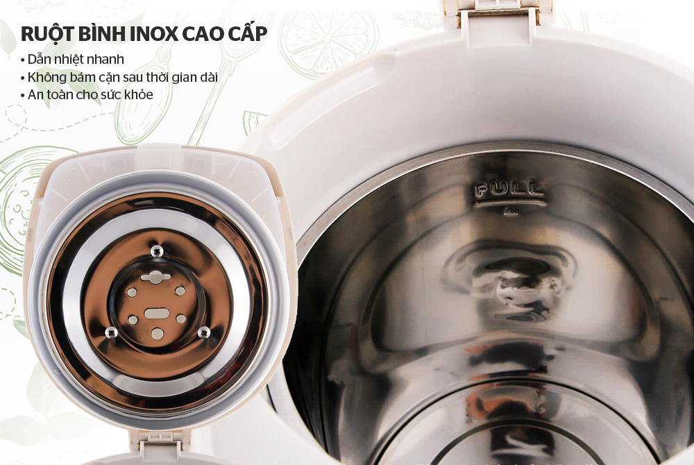 Bình thủy điện có kết cấu 2 lớp với ruột bình làm từ inox SUS304 (thép không gỉ) cao cấp. Chất liệu này dẫn nhiệt nhanh, đun sôi nước trong thời gian ngắn nhưng không bị oxy hóa, không bám cặn sau khi sử dụng một thời gian dài.