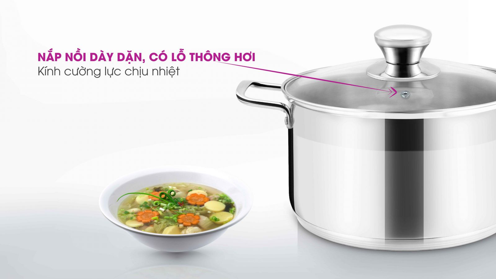 Vung kính cường lực trong suốt: Nồi được trang bị vung kính cường lực dày 4mm, trong suốt giúp bạn dễ dàng quan sát thực phẩm bên trong nồi. Viền mép vung được đệm inox, vừa tạo sự sang trọng, vừa hạn chế bể vỡ khi va đập.