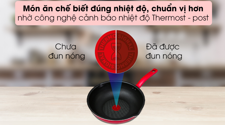 Với công nghệ này, khi chảo đủ nóng điểm báo nhiệt ở giữa lòng chảo sẽ thay đổi màu sắc và chi tiết cho bạn dễ dàng nhận biết chảo đã đạt nhiệt độ lý tưởng, có thể cho thực phẩm vào chiên xào ngay.