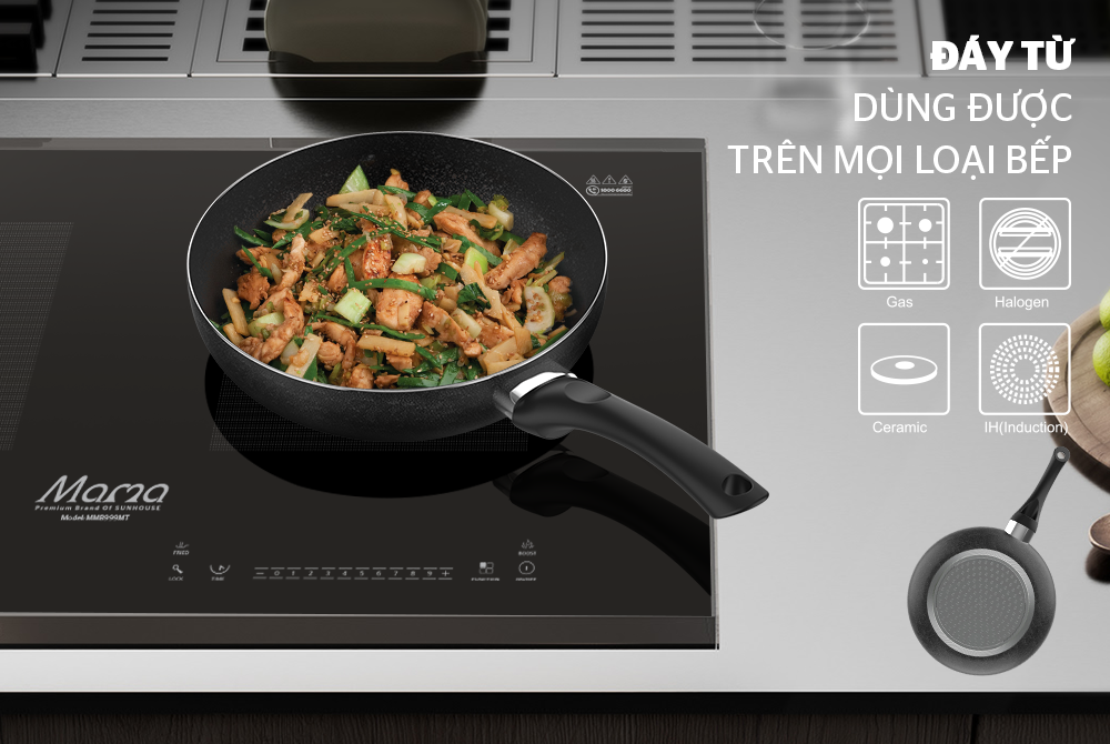 Chảo được cấu tạo đáy từ nên sử dụng được trên mọi loại bếp: bếp từ, bếp gas, bếp hồng ngoại.