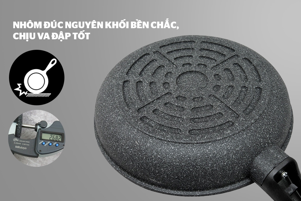 - Nấu ăn nhanh hơn, tiết kiệm thời gian và nhiên liệu: Chất liệu hợp kim nhôm tráng vân đá hoa cương bắt nhiệt rất tốt, tỏa đều giúp dễ dàng xào nấu với lượng thực phẩm vừa đủ cho gia đình từ 4-6 người.