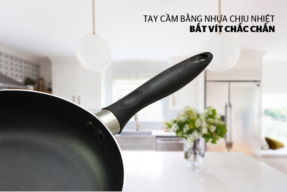 - Tay cầm: Tay cầm được bắt vít chắc chắn vào thân chảo, đảm bảo an toàn trong quá trình sử dụng, nâng nhấc, di chuyển. Cán cầm bằng nhựa chịu nhiệt siêu bền có độ dài vừa phải, chống bỏng, hạn chế trơn trượt.