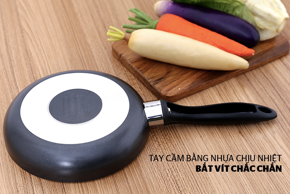 - Tay cầm: Tay cầm được bắt vít chắc chắn vào thân chảo, đảm bảo an toàn trong quá trình sử dụng, nâng nhấc, di chuyển. Cán cầm bằng nhựa chịu nhiệt siêu bền có độ dài vừa phải, chống bỏng, hạn chế trơn trượt.