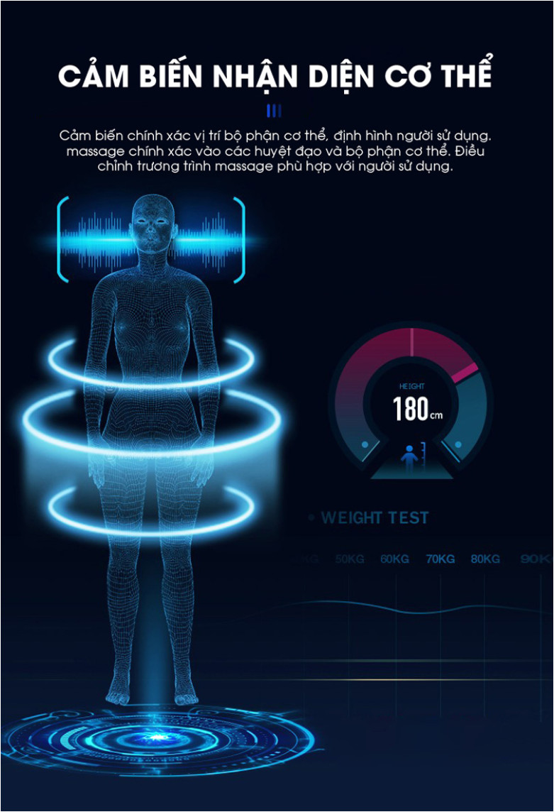 Thiết kế trang bị cảm biến nhận diện cơ thể giúp cảm biến chính xác vị trí bộ phận cơ thể, định hình người sử dụng. Massage chính xác các huyệt đạo của các bộ phận trên cơ thể, kết hợp điều chỉnh chương trình massage phù hợp với người sử dụng.