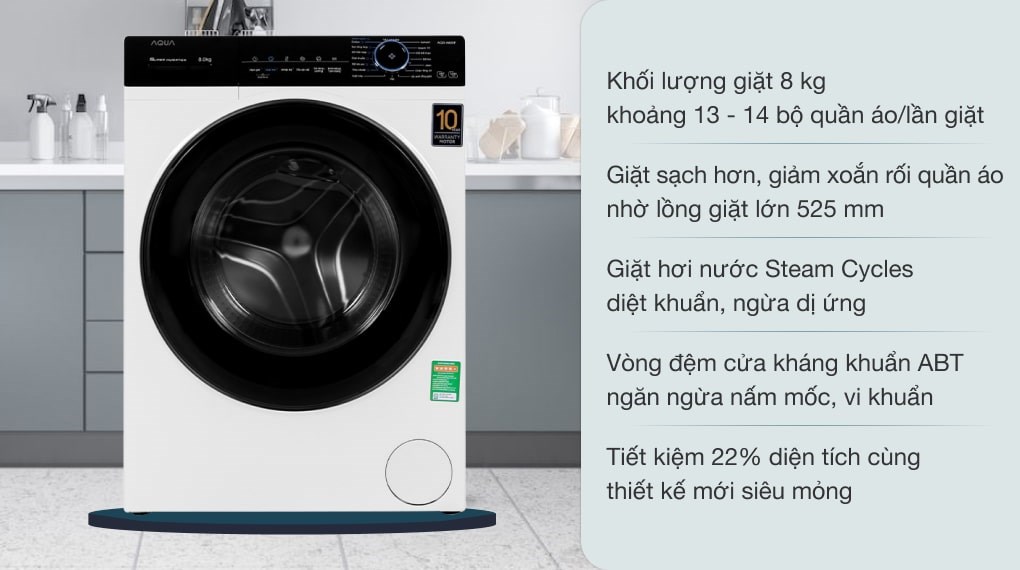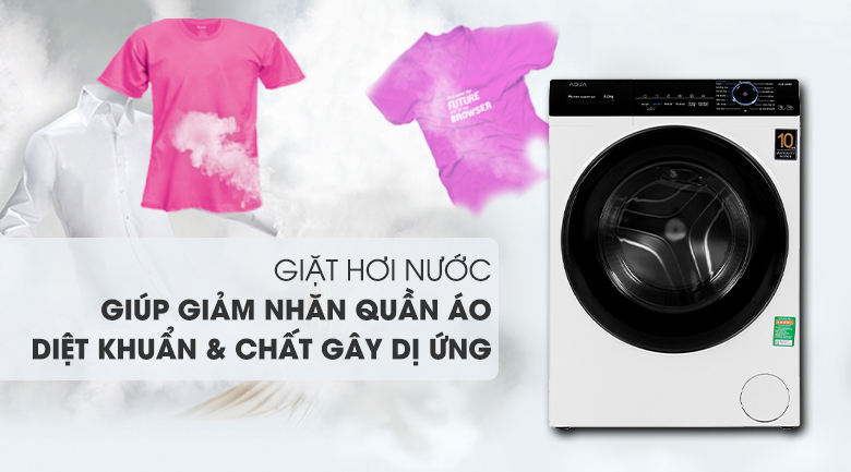 Chiếc máy giặt Aqua này còn sở hữu công nghệ giặt hơi nước, giúp cho quần áo được diệt khuẩn tối ưu cũng như loại bỏ hầu hết những tác nhân gây dị ứng còn bám trên đồ và giảm thiểu mức độ nhăn của quần áo sau khi giặt.