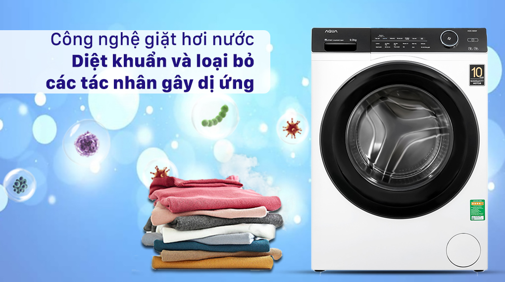 Máy giặt Aqua này còn sở hữu công nghệ giặt hơi nước, giúp cho quần áo được diệt khuẩn tối ưu cũng như loại bỏ hầu hết những tác nhân gây dị ứng còn bám trên đồ và giảm thiểu mức độ nhăn của quần áo sau khi giặt.