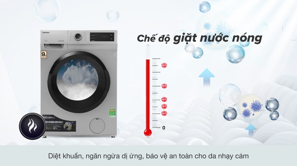 Công nghệ nước nóng sẽ góp phần giặt sạch các vết bẩn cứng đầu dễ dàng hơn, đồng thời hỗ trợ diệt khuẩn hiệu quả nhằm mang lại sự an toàn và an tâm cho người sử dụng, nhất là trẻ nhỏ và người lớn tuổi có làn da nhạy cảm.