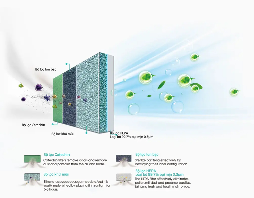 Sự kết hợp của 4 loại bộ lọc khác nhau có thể loại bỏ hiệu quả tất cả các loại bụi bẩn, vi khuẩn, nấm mốc và mùi hôi trong không khí, giúp làm sạch không khí trong nhà, bảo vệ sức khỏe gia đình.