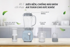 Cối xay sinh tố dung tích lớn (1.5L), phù hợp sử dụng cho gia đình 3 – 5 người. Sản phẩm còn có một cối nhựa để xay hạt khô (cà phê, tiêu, lạc…) và một cối cỡ vừa chuyên dùng để xay thịt, cá, tôm…vô cùng tiện lợi.