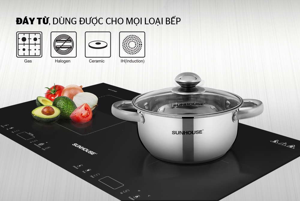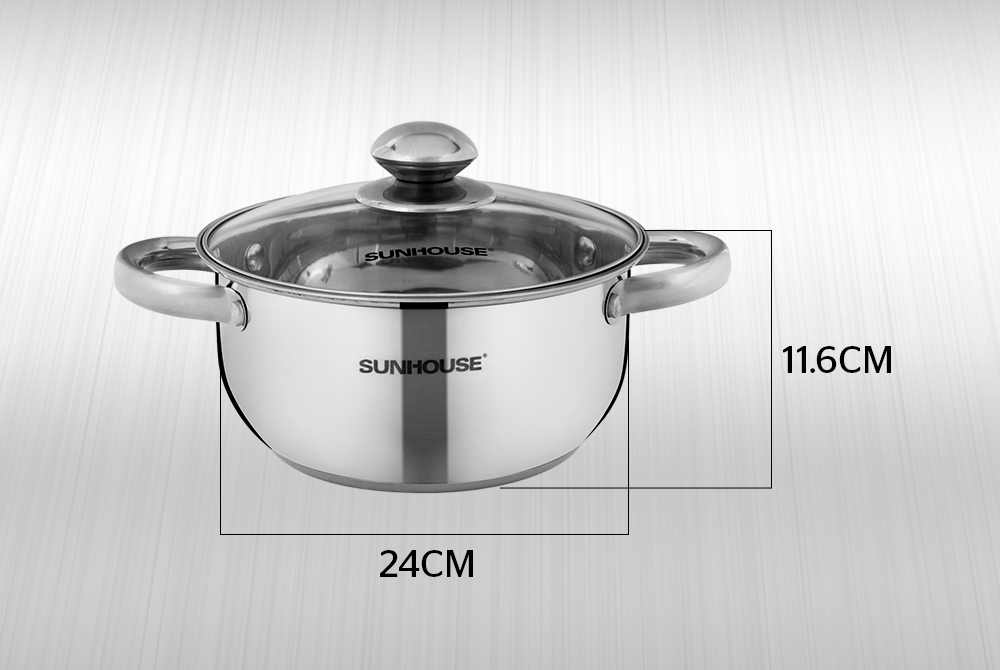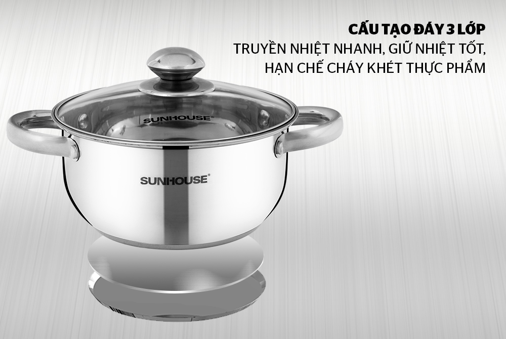 Nồi inox 3 đáy SUNHOUSE SH22124 sử dụng được với mọi loại bếp, kể cả bếp từ. Sản phẩm với đường kính 24cm, thích hợp để luộc rau, nấu canh, nấp súp, nấu lẩu và chế biến nhiều món ăn khác cho gia đình.