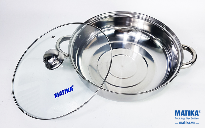 Nồi lẩu Inox đáy từ Matika MTK-HP30 có vung làm bằng thủy tinh trong suốt, giúp quan sát thực phẩm bên trong nồi dễ dàng.