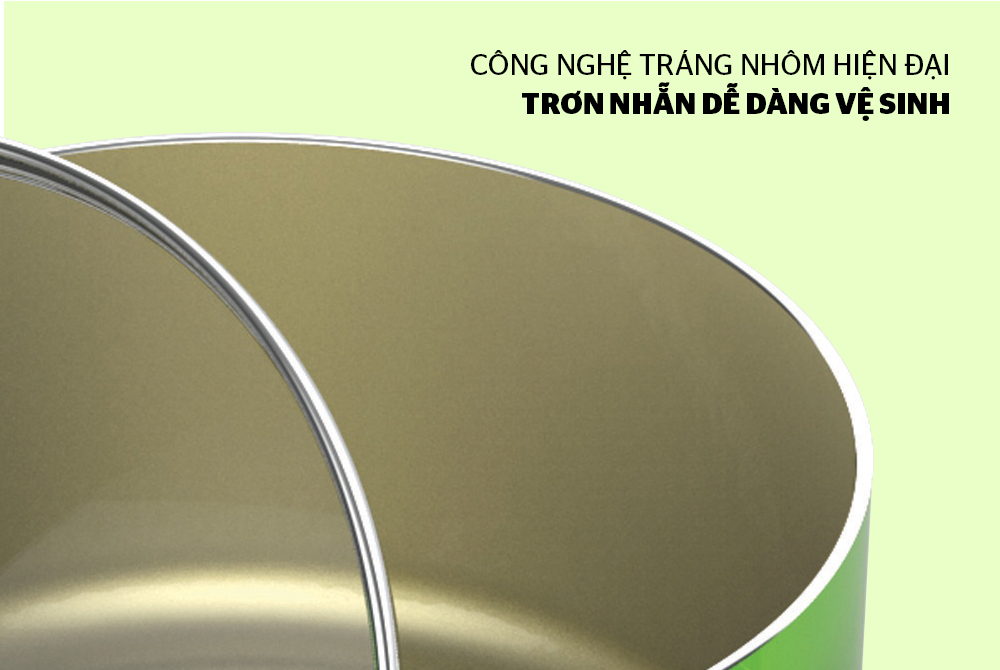 - Bề mặt sáng bóng, màu sắc nổi bật: Nồi được sản xuất trên dây chuyền công nghệ tráng nhôm hiện đại, gia công chất lượng nên có bề mặt trơn nhẵn, sáng bóng, dễ lau chùi. Vỏ ngoài màu xanh nổi bật, chịu nhiệt tốt, không biến màu theo thời gian.