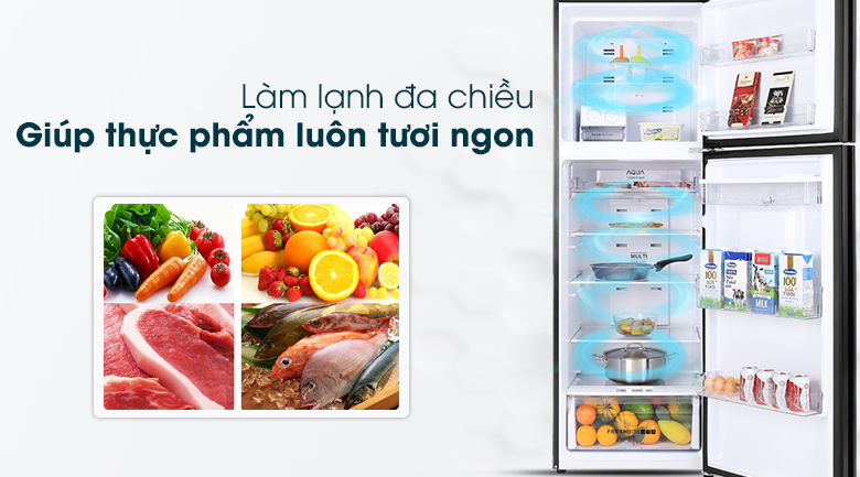 Nhờ hệ thống khí lạnh đa chiều, thực phẩm được bảo quản lạnh một cách toàn diện khi hơi lạnh được thổi ra từ nhiều cửa và lan tỏa, phân bố đều bên trong mỗi ngăn tủ lạnh.