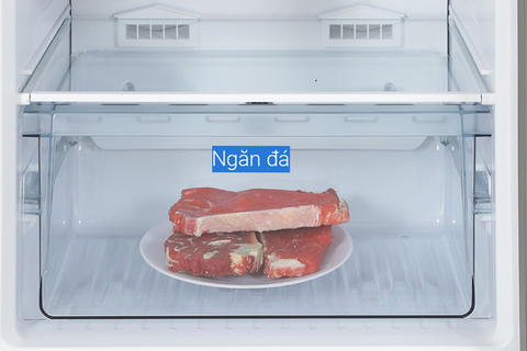 - Ngăn đá có dung tích 97 lít, gồm có các kệ chia làm các ngăn cùng với hộp làm đá tự động và ngăn chứa.