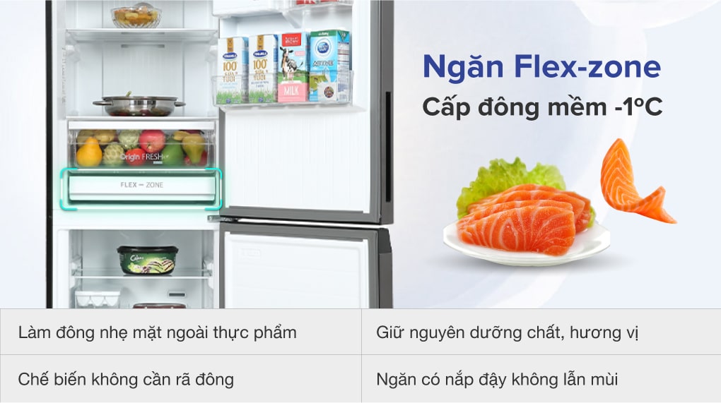 Tủ lạnh trang bị ngăn đông mềm Flex-zone -1 độ C để bảo quản các loại thịt, cá,... ở nhiệt độ đông lạnh đến 3-4 ngày mà thực phẩm vẫn tươi ngon, giữ nguyên chất dinh dưỡng, đặc biệt là không cần phải rã đông thực phẩm như những tủ lạnh khác, giúp bạn tiết kiệm thời gian hơn trong việc chế biến đồ ăn.
