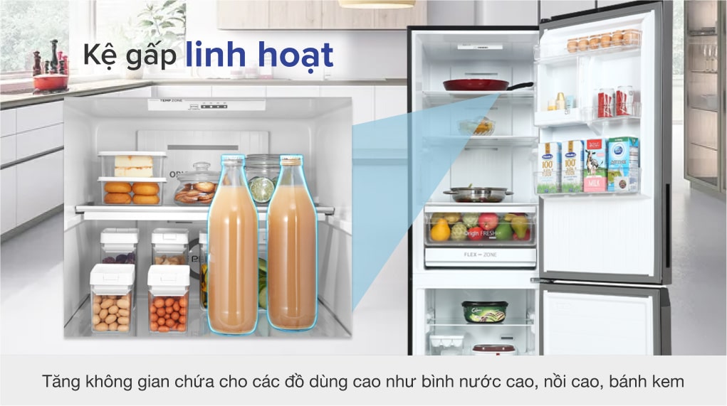 Ngăn kệ trên cùng của tủ lạnh có thể gập lại và mở ra một cách linh hoạt, tăng thêm không gian chứa cho các loại thực phẩm có kích thước cồng kềnh như bình nước ngọt lớn, các loại nồi, hộp cao, bánh kem,...
